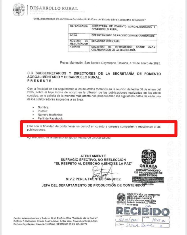 El oficio enviado por Fuentes Sánchez pedía a los subsecretarios y directores una lista con los nombres de sus subordinados, acompañada de su puesto, número telefónico y enlace a su perfil de Facebook. Según el documento, el objetivo era “mantener un control” sobre las publicaciones compartidas y las reacciones en dichas plataformas.