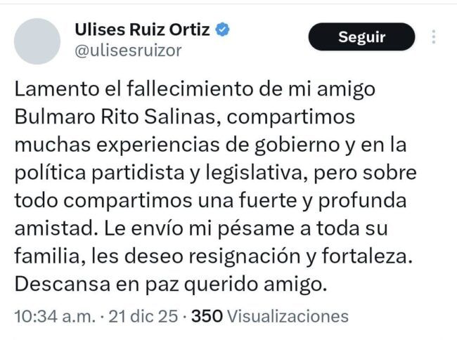 Familiares del licenciado Bulmaro Rito Salinas confirmaron su fallecimiento este domingo 21 de diciembre de 2025, a las 10:00 horas, en un hospital de la Ciudad de México. El político oaxaqueño luchaba contra el cáncer, según informes. Su partida fue anunciada por allegados y confirmada por excolaboradores, generando condolencias inmediatas en redes sociales y círculos políticos.