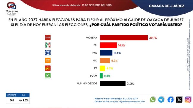 Los malos resultados de los gobiernos emanados de Morena en Oaxaca, especialmente en la capital, han provocado una caída significativa en sus preferencias electorales. De acuerdo con la más reciente encuesta de Massive Caller, el partido guinda registra apenas un 39.7% de apoyo rumbo a las elecciones municipales de 2027.