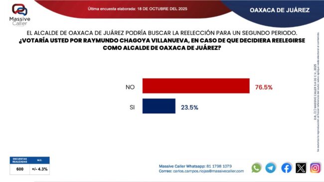 El estudio revela, además, un fuerte rechazo hacia el actual presidente municipal de Oaxaca de Juárez, el neomorenista Raymundo Chagoya Villanueva. Más del 76.5% de los encuestados afirmó que no volvería a votar por él en caso de buscar la reelección, reflejando un profundo descontento con su desempeño al frente del Ayuntamiento.
