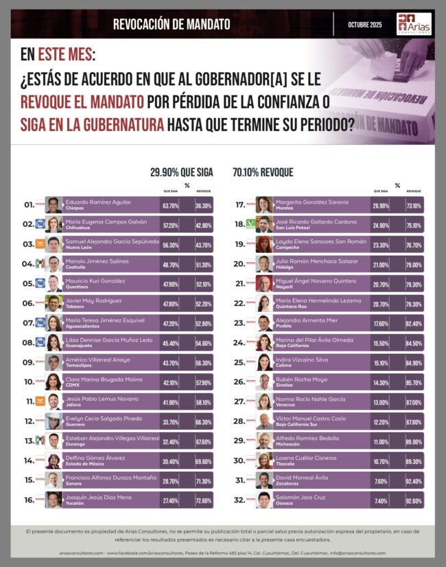 La más reciente encuesta de Arias Consultores coloca a Oaxaca como la entidad con el mayor nivel de desaprobación hacia su gobernador. Un contundente 92.6% de los oaxaqueños considera que Salomón Jara Cruz debe ser revocado por pérdida de confianza, dejando solo un marginal 7.4% a favor de que concluya su mandato.