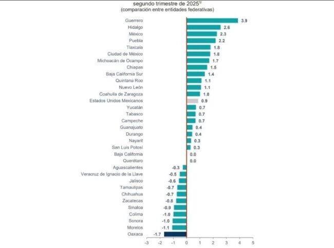 De acuerdo con el INEGI, solo 18 de las 32 entidades federativas crecieron en el trimestre. Mientras estados industriales del centro-norte, como Hidalgo, Guanajuato y Nuevo León, lideraron el crecimiento nacional, Oaxaca y otras regiones del sur mostraron rezagos que amplían la brecha económica entre el norte productivo y el sur empobrecido.